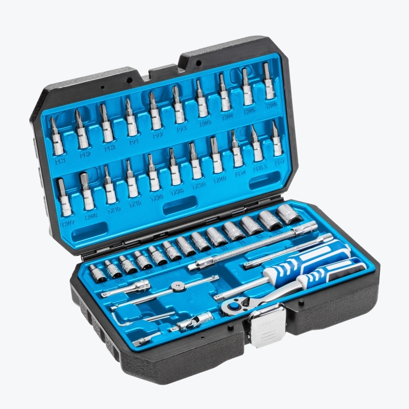 Set capete prize, biți de șurubelniță, accesorii 1/4". Prizele, biți și accesoriile sunt realizate din oțel aliat CrV de înaltă calitate. Rezistent la sarcini intense. Fabricat prin forjare. Clichetul cu 72 de dinți este realizat din oțel aliat CrMo, crescând durabilitatea mecanismului și precizia de funcționare.
