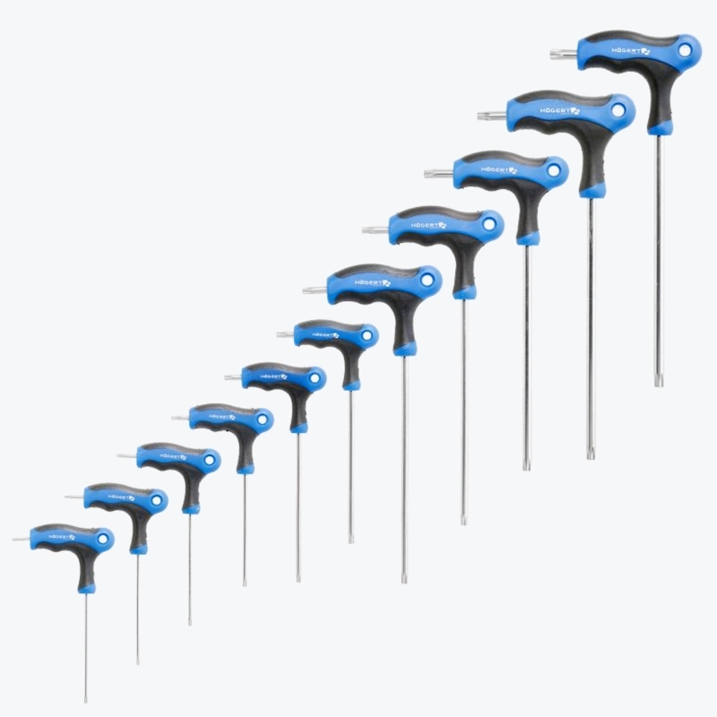 Un set de 10 chei torx security lungi, de precizie, fabricate din oțel aliat S2 de cea mai bună calitate, garantând o rezistență maximă și rezistență la deformare și răsucire. Utilizarea unui mâner în formă de „T” contribuie la confortul de utilizare și asigură o prindere sigură. Ideal pentru deșurubarea și strângerea șuruburilor în spații înguste. Indispensabile în ateliere, precum și pentru lucrările de renovare și de construcție, precum și în fiecare gospodărie.
